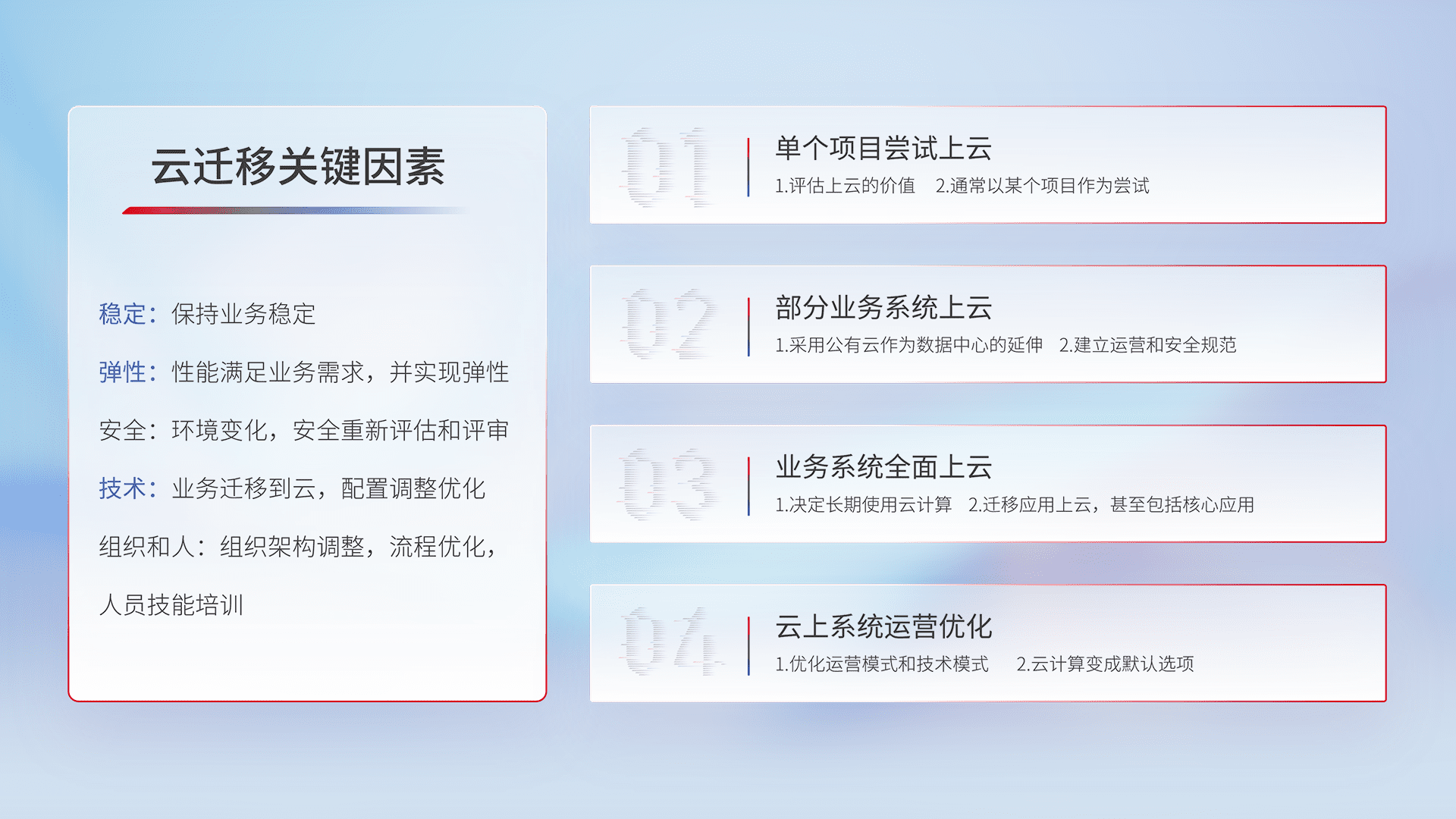 结合实际业务,,,从规划设计、、云平台选型、、、云原生改造、、、数据迁移、、集成交付,,,迁移全过程为客户识别最佳上云路径,,,做好风险识别管理,,设计网络架构、、、身份权限、、安全审计合规、、、操作审计、、日志审计、、监控告警策略、、、、多站点容灾设计等,,,,对云上基础设施进行整体规划,,提升IT治理水平,,,以满足弹性、、高可用、、、、高性能的需求。。。